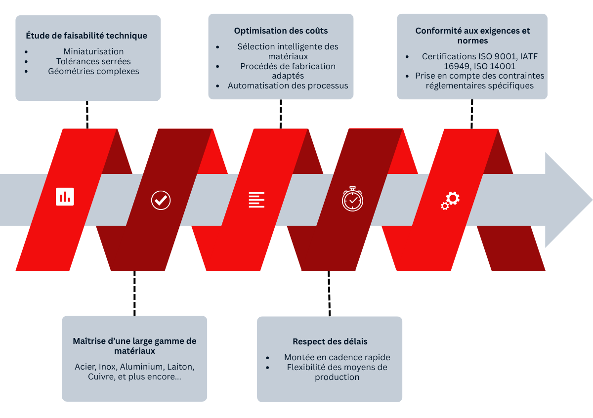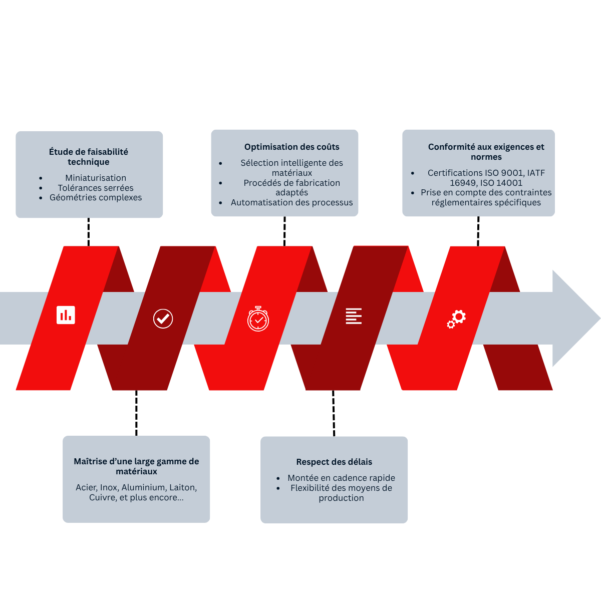 Pour ses clients, AMD Décolletage propose une démarche structurée en étapes clés allant de l’étude de faisabilité à la production série :